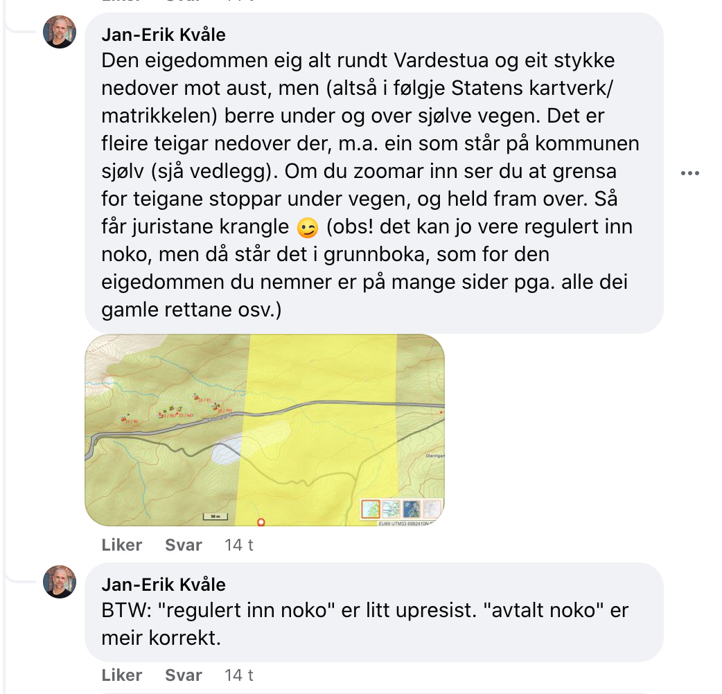 Turvegene i området tilhører som vi ser en (oppdelt) eiendomsteig. Men se på Vardevegen, DEN har de ikke eierskap til! Igjen - eiendommen går under og over vegen.