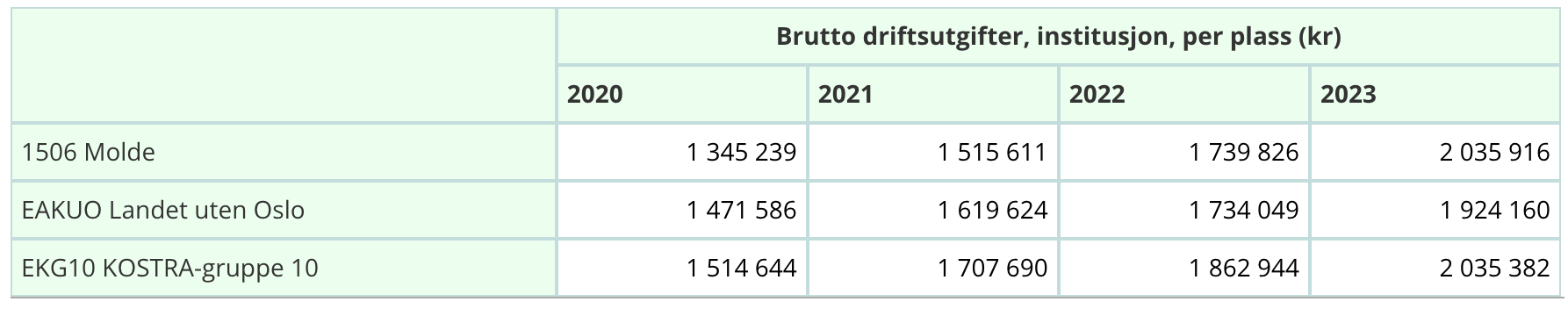 I Molde registrerer de ikke Aldershjem, men Sykehjem. Og Barneboliger er det ikke så mange av (2020: 7, 2021: 7, 2022: 6 og 2023: 5).