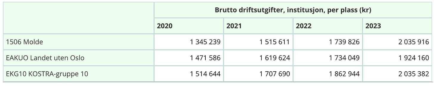 Legger du på Ringerike (fra søylediagrammet over), en kommune på om lag samme tall innbyggere (og areal! - men paddeflatt, da, og ikke øyer og ferger), vil du se at de er en flinkis på HO-utgifter pr. innbygger, men en versting i utgifter pr. institusjonsplass: 2 399 119,-….. bare 363 203,- mer enn Molde.