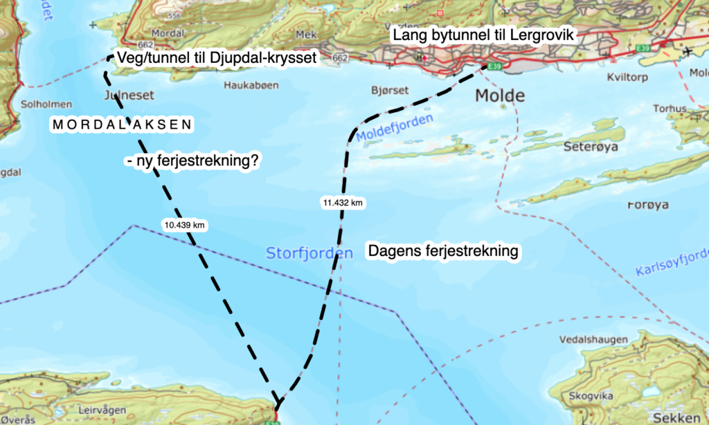 KrF-medlem Kjell Petter Stene frå Molde vil legge E39 via Møreaksen på is, og erstatte den med ferje til Mordalsvågen. Dette er eit bærekraftig alternativ som samtidig bidrar til å løyse trafikale utfordringar i Molde sentrum, hevdar han.