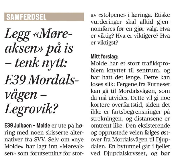 Dermed blandar han inn Møreaksen som ein openberr faktor i diskusjonen om vegløysingar inn, gjennom og ut av Molde by. Dette er nok ikkje heilt god latin hjå dei som har hevda at desse prosjekta ikkje heng saman.
