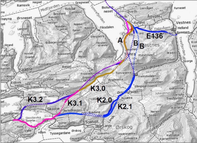 Nye Veier kan fint ta hele greia fra Tresfjordbrua, oppover Skorgedalen og, om ønskelig, helt til Ålesund - inkludert en splitter ny og rask E136 arm i dagen mellom Tresfjordbrua og tunnelinnslaget på Vik.