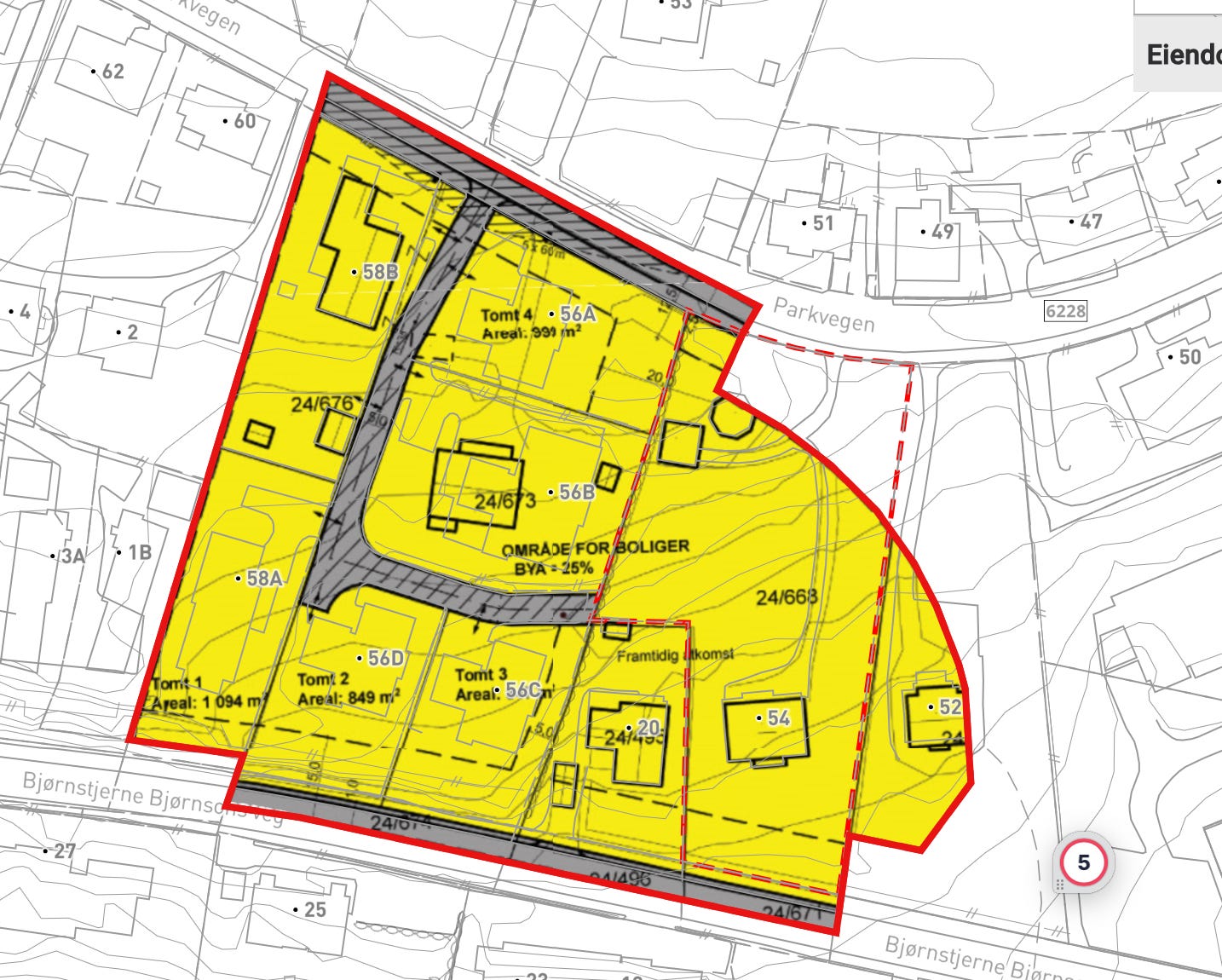 Det betyr at for Parkvegen 54, som er ei enkeltståande tomt i planen, er det pr i dag kun tillatt med 25 % BYA, altså bebygd areal på tomta.
