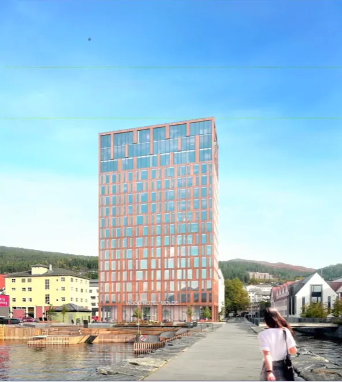 Et slikt bilde som du ser over her, vil du trolig aldri se igjen. Det illustrerer det foreslåtte Wood Hotel Molde, sett fra litt avstand; utkanten av tjukkeste bysentrum.