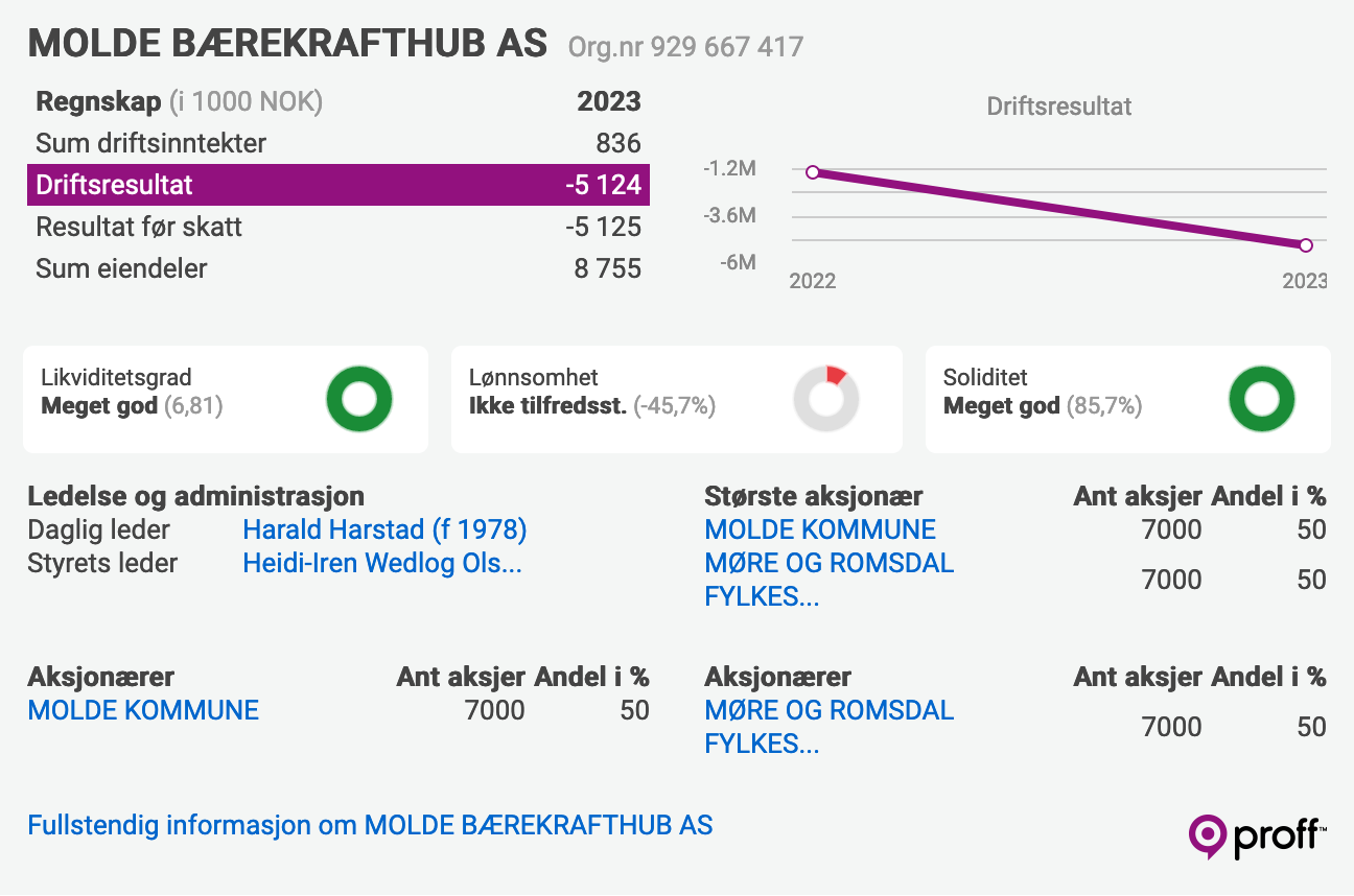 Molde bærekrafthub AS er her, har tre ansatte (til 2,2 mnok i året) med nyinnkjøpte snippskjorter m/logo og et snertent lokale på Reknes.