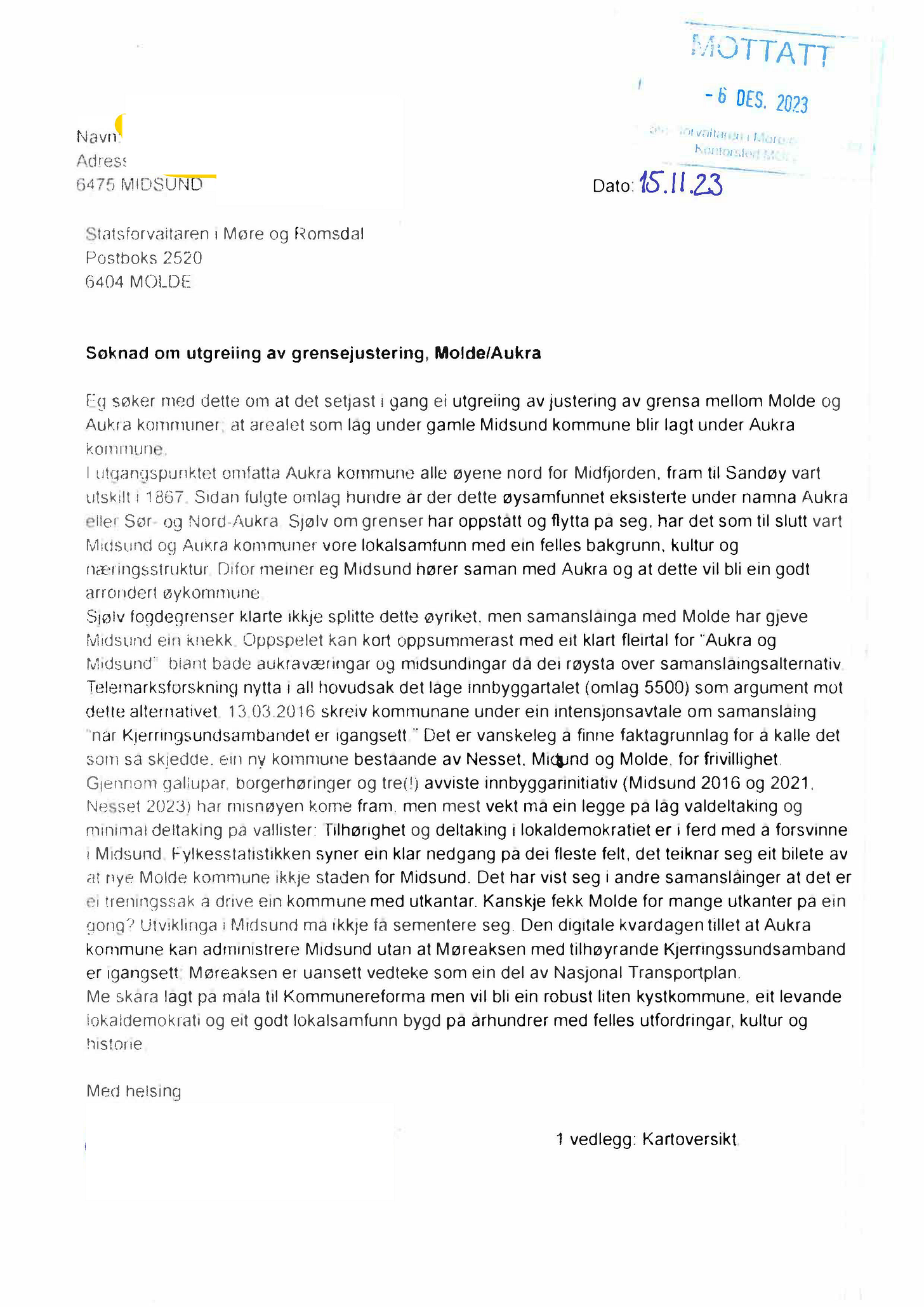 Statsforvaltaren, som skal behandle saka, har no gitt Molde og Aukra kommunar frist til 24. februar neste år med å kome tilbake med ei uttale.